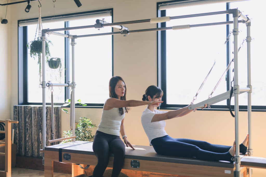 基本的には動きやすい服で大丈夫です。ただピラティスの特性上、トレーナーは背骨や骨盤の動きを見ているので、可能な限り身体にフィットしたウェアにお着替え頂き、レッスンにご参加ください。また足が滑ると動きがとりづらい為、滑り止め付きの靴下(ヨガソックスなど)を履いて頂くか、素足でご参加ください。